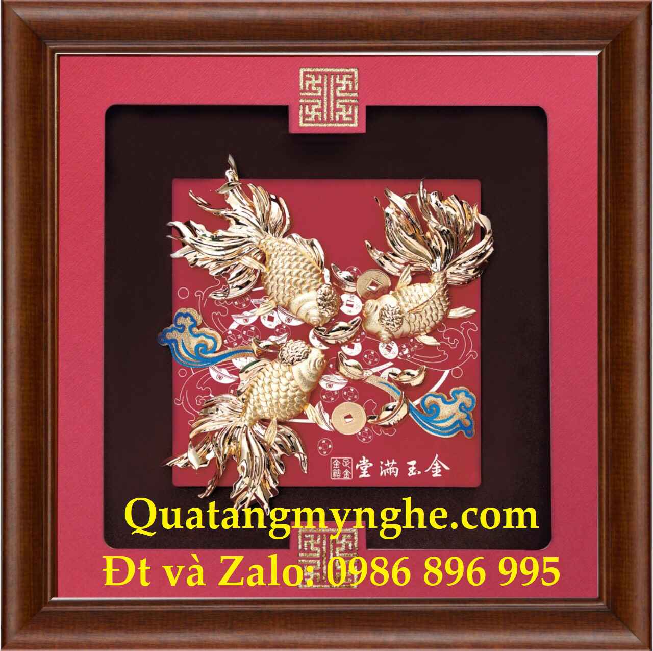Tranh Ba con cá chép mạ vàng, nền đỏ cao cấp, Quà tặng phong thủy ý nghĩa may mắn, cát tường.